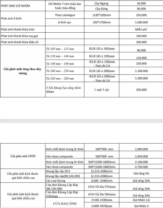Đơn giá trên chỉ bao gồm cánh và khung bao. Chưa bao gồm phụ kiện, chi phí vận chuyển và lắp đặt