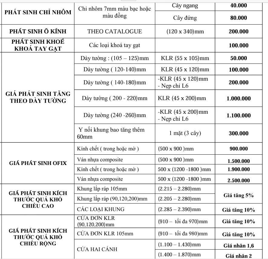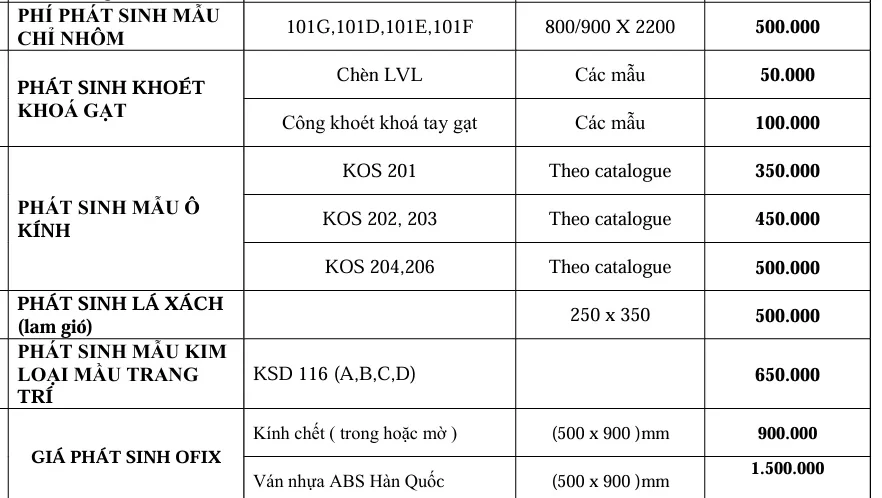 Dưới đây là bảng giá phát sinh và các phụ kiện khác theo yêu cầu từ khách